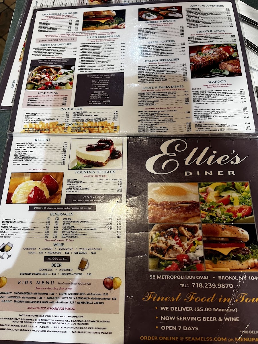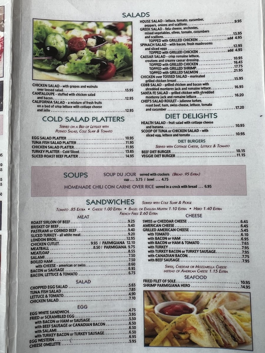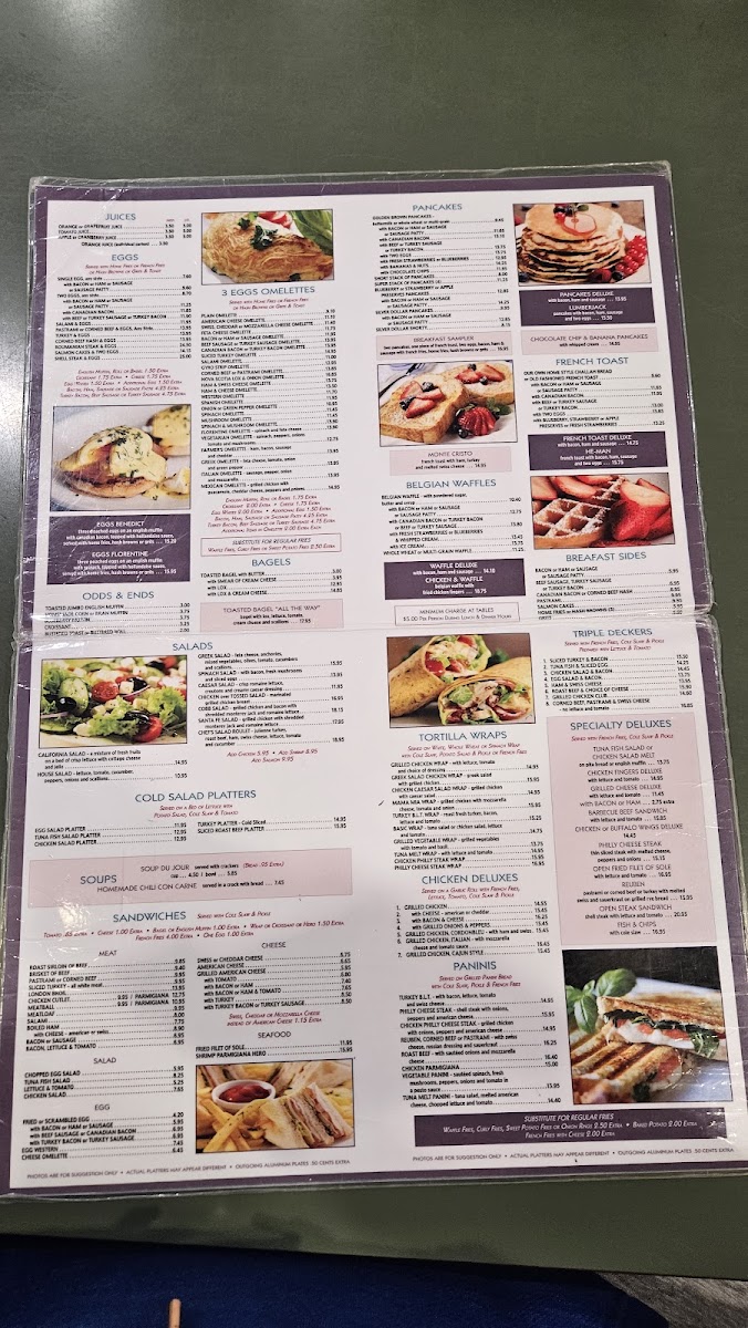The menu offers a variety of options suitable for breakfast, light meals, and casual dining throughout the day. It includes classic diner-style dishes alongside a selection of sandwiches, salads, and side orders. Drink choices such as coffee and fresh juices are also available to complement meals.