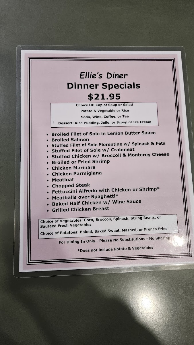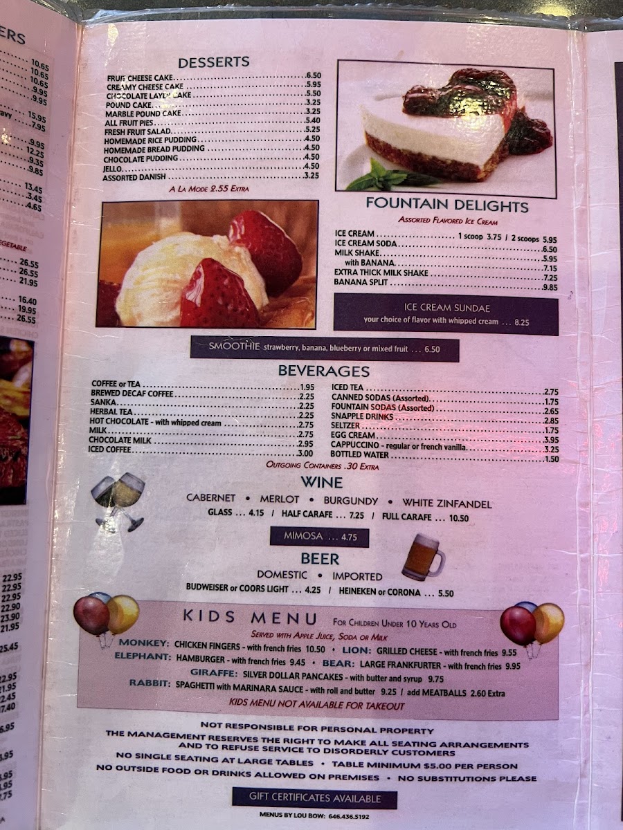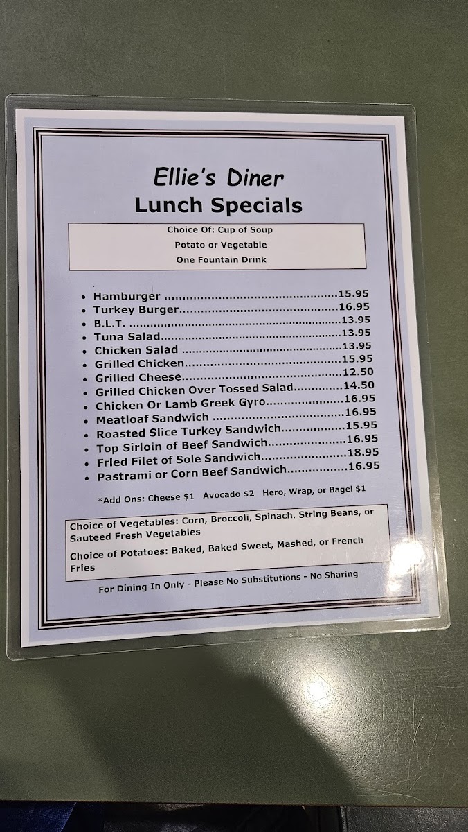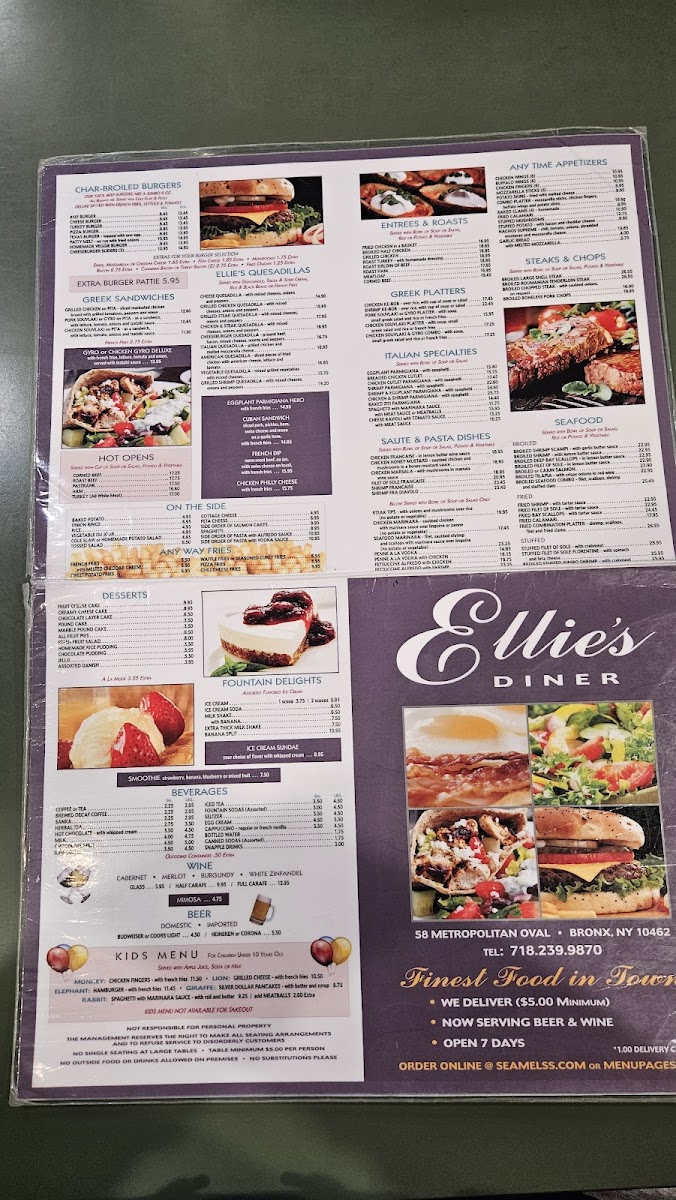 The menu offers a variety of options suitable for breakfast, light meals, and casual dining throughout the day. It includes classic diner-style dishes alongside a selection of sandwiches, salads, and side orders. Drink choices such as coffee and fresh juices are also available to complement meals.