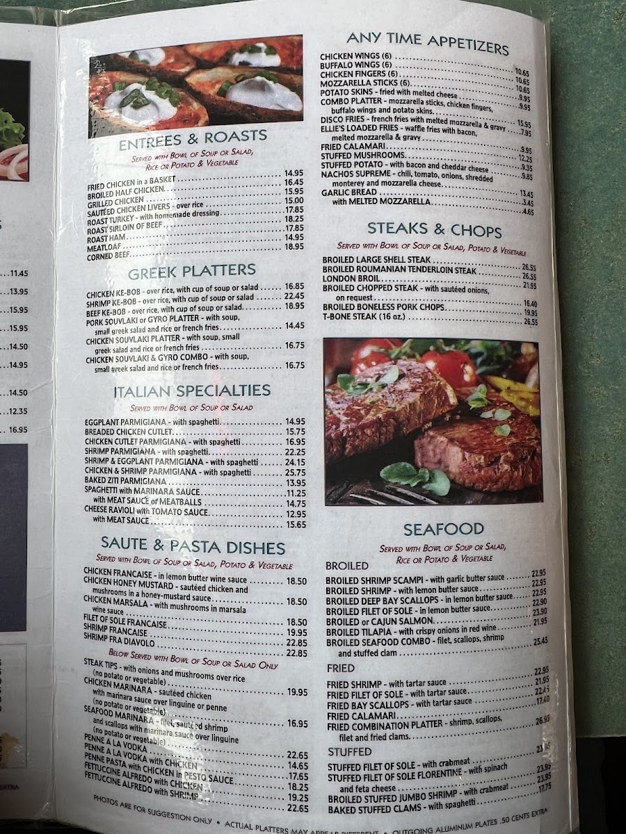 - Sides and Light Bites: Various accompaniments such as baked potatoes, onion rings, coleslaw, homemade potato salad, tossed salad, and cottage or feta cheese.